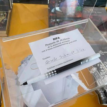 Ganadora de la rifa de 10 libros de la Editorial Arboleda, un vino y dos tazas conmemorativas. Fiesta del Libro UCR 2022