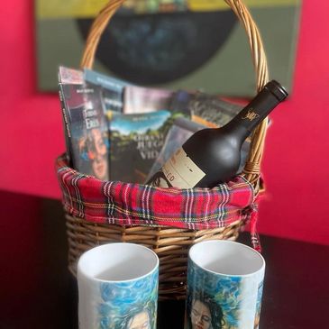 10 libros de la Editorial Arboleda, un vino y dos tazas con portadas de la colección